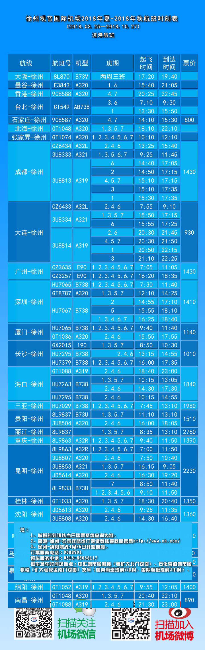 徐州观音国际机场2018年夏秋季航班时刻表